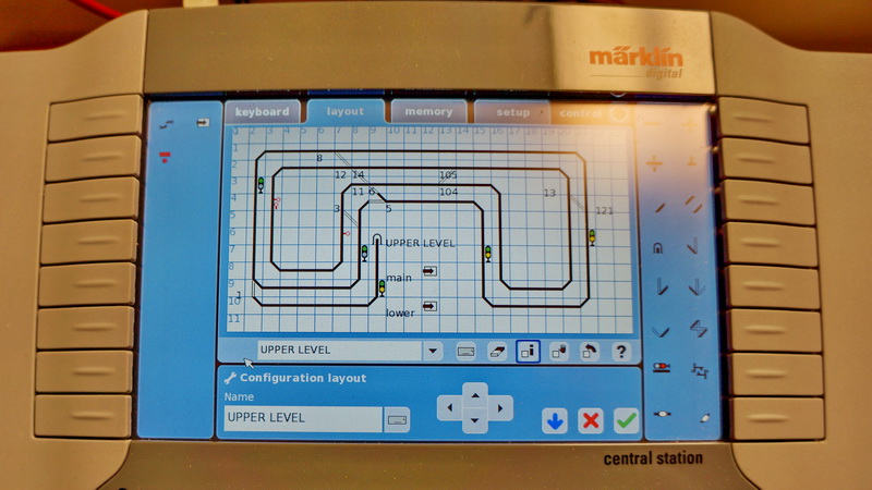 The Layout mode of the CS allows you to draw the layout with turnouts and signals. Clicking on either of these will change the turnout or signal. Note the wrench that takes you to the screen for creating the layout. Next to it is the current layout name. You can scroll down to see other layouts.  If your layout takes up more than the screen size you can move right or left, up or down with the arrow keys which are to the right of the current layout name. (See picture below of the Layout Drawing screen. The drawing tools for track, turnouts and signals are on the right side of the screen.)