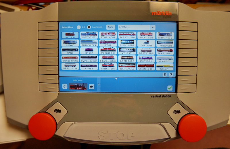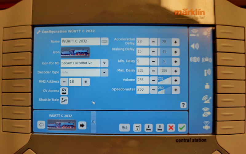 Using the stylus that is part of the Central Station, or a mouse which I use, or pressing the tabs on the outer edges of the CS you can control the functions. The icons for functions are changeable. Note the picture of the loks with their name. The arrows on either side control direction and indicate in which direction the lok is traveling. Clicking on the lok picture allows you to bring up all the loks that I have programmed into the CS. The CS recognizes any mfx decoders and transfers all the functions, the lok name and the lok picture/icon to the data base on the CS. (See first picture below of the Icon screen below from which you can choose a lok.) The wrench icon takes you to a lok set up screen that allows you to change set functions and function icons as well as a number of  adjustments including volume, acceleration/decelleration speeds, braking settings, etc. (See second picture below of the Lok Setup screen.) You can create a new lok by clicking on the arrow next to the Create window in the upper right and you will be asked if you want to use the data base or create the lok set up for a lok not in the data base.  For the latter you must know the decoder number. If you have changed the factory setting for a lok, the setup screen will allow you to enter it as a lok not found in the data base. The CS will search its data base for a lok if you know the Marking catalog number.