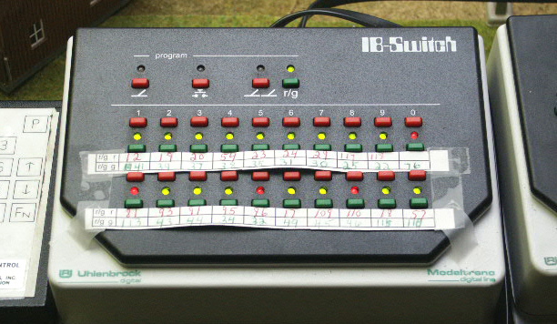 The Profi-Control unit is a cab control device, a Lokomotiven vorbildferecht steuern. It is actually two FREDS arranged as a cab controller of a diesel or electric lok. The numbers above the flip switches are used to select the lok you want. You can see that I have set the F1 - F8 keys for various diesel and electric loks.