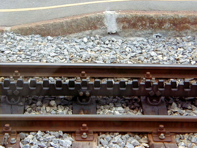 A close-up view of the cog bar in the center of these BVZ narrow gauge tracks.