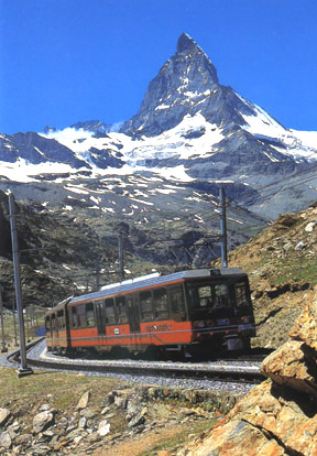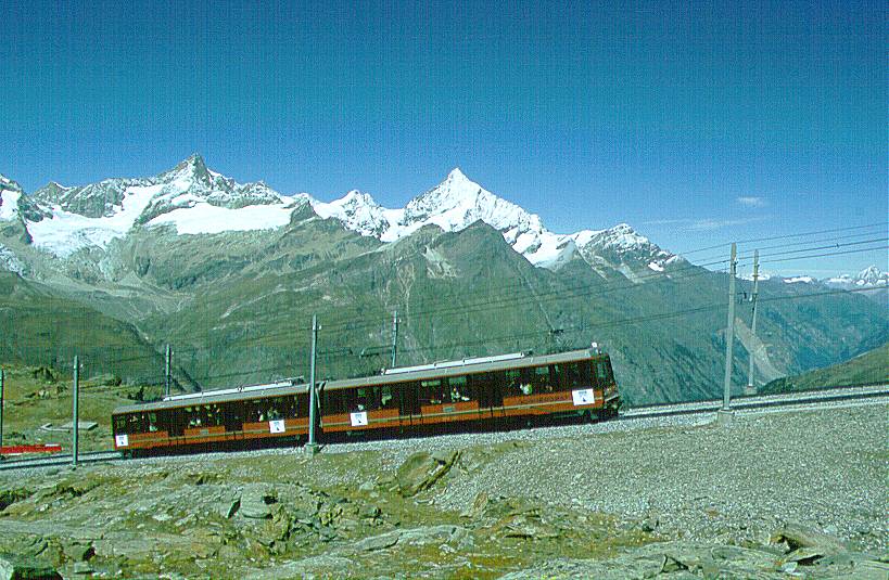 Gonergratbahn (GGB) Bhe 4/8 3052 rack railcar climbing to the Matterhorn. Copyright 1998 Stefan Dringenberg, 02-08-99