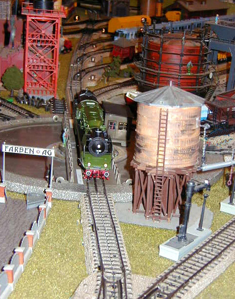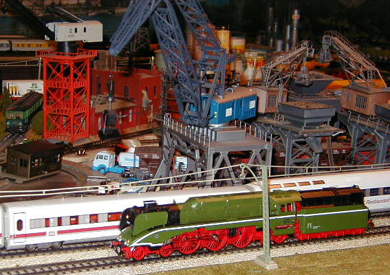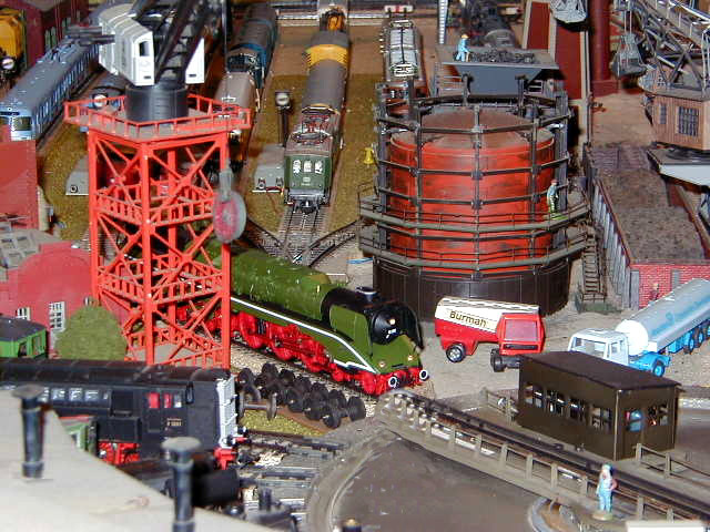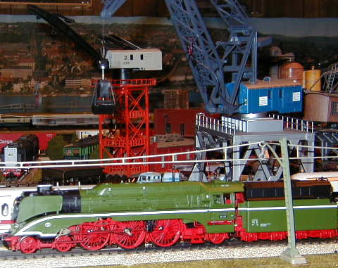 The DB-AG 18 201 steam lok passing the gantry crane.
