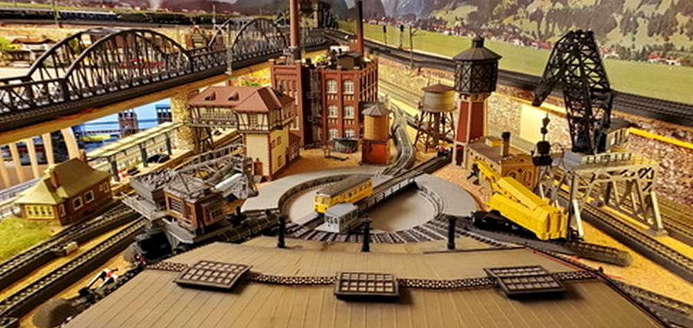 This is a wide view of my layout as of June 2024. It shows parts of all three levels. Note the addition of two spurs added to the main/middle level and one spur on the lower level.