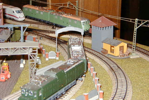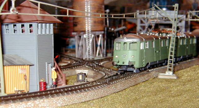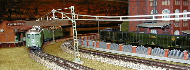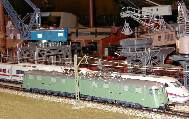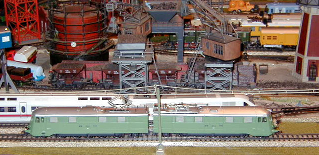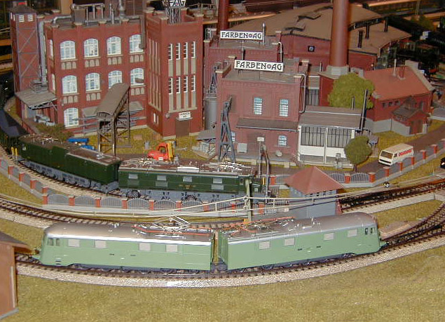 The Roco Ae 8/14 Landi-Lok passes the Farben factory where a Märklin Ae 8/14 sits on a siding with a consist of empty hopper cars.