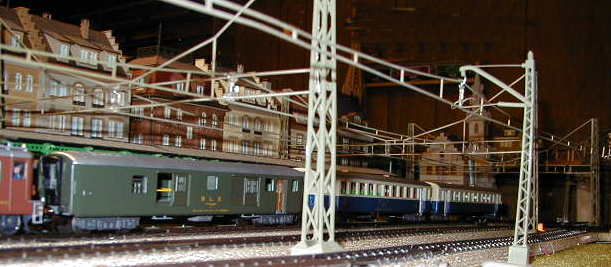 The Roco BLS Ae 8/8 pulling a consist of passenger cars toward the trestle.