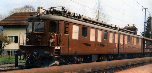 A HAG BLS baggage car behind a BLS Ae 8/8.