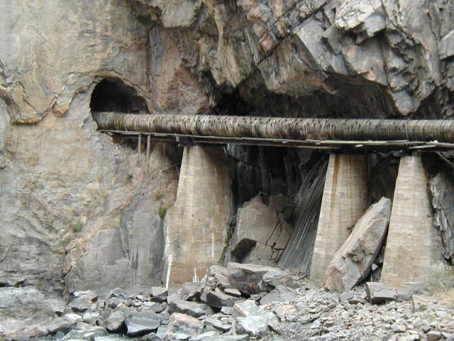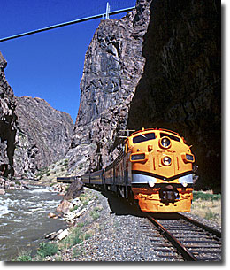 The Royal Gorge Railroad tracks follow the Arkansas River which has its headwaters near the Leadville Colorado & Southern RR. Click on picture to return to description.