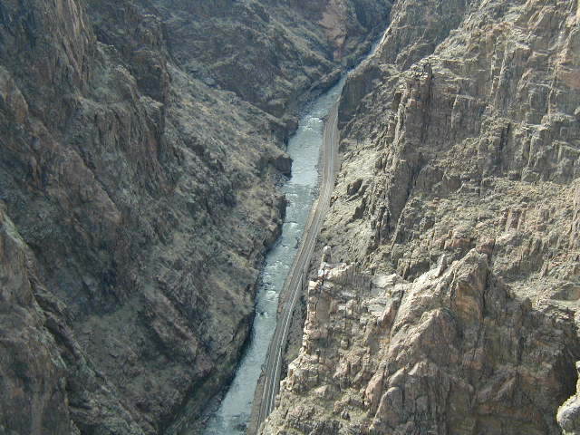 Looking down 1,000 feet from the Royal Gorge Bridge to the track suspension bridge. Click on picture to return to description.