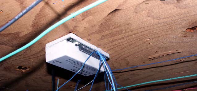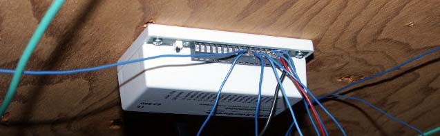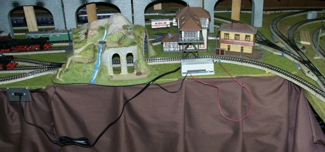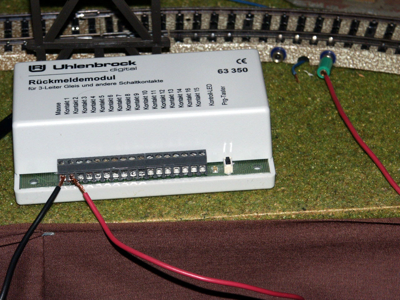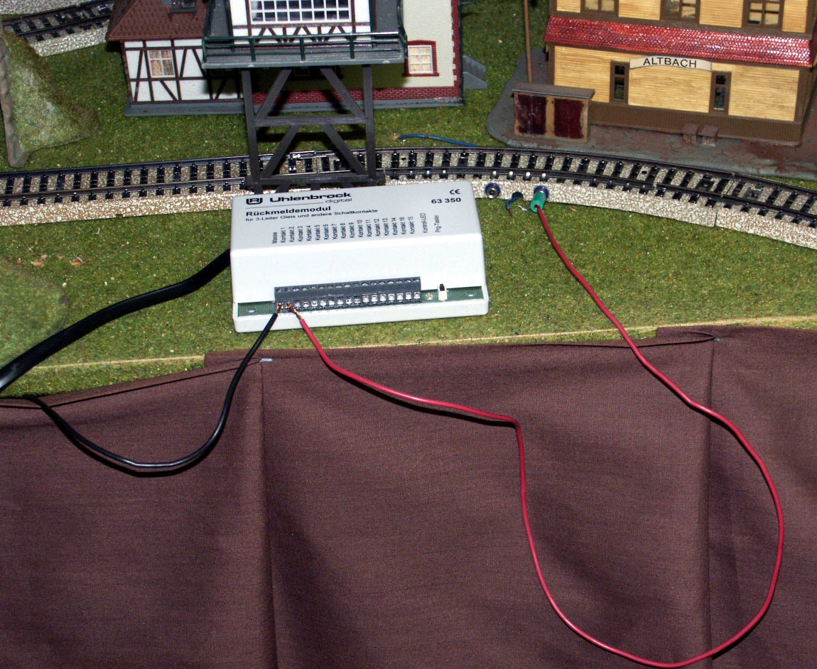The Uhlenbrock S88 (63 350) attached to a contact track for testing purposes.  The unit will be mounted under the layout for regular use. The unit is connected to the LocoNet  with a six wire cable, the black ground wire is connected to the common ground and the red wire is connected to a contact track.