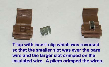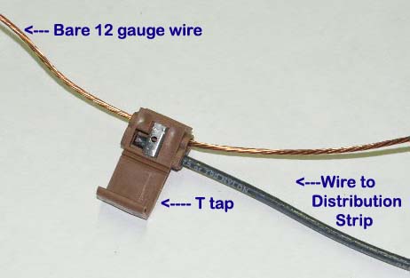 A T tap used to connect a distribution strip to the bare 12 gauge wires.