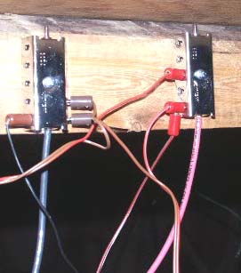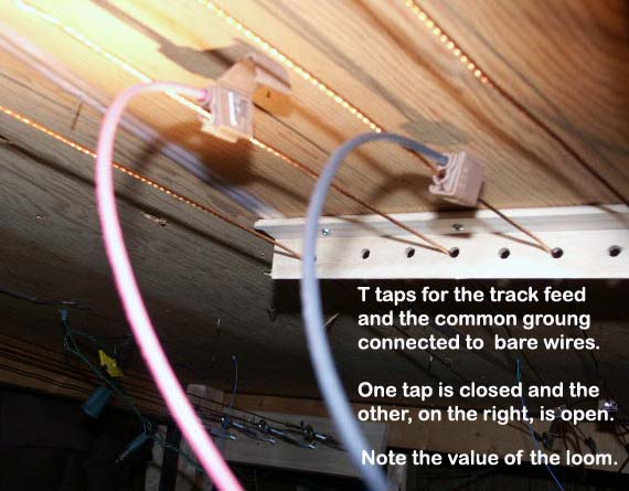 T taps connecting a distribution strip to the bare 12 gauge wires.